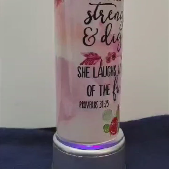 It is elegantly wrapped in Proverbs 31:25 while flowers and vines nestle close to the powerful scripture.
